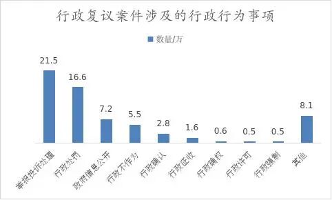从行政行为事项上看,举报投诉处理、行政处罚、政府信息公开类案件数量较多,共占受理总量的69.8%。其中,举报投诉处理和行政处罚类案件数量同比分别上升33.0%和27.8%,政府信息公开案件数量则同比下降31.7%。前五位数量和占比分别是:举报投诉处理21.5万件,占33.1%;行政处罚16.6万件,占25.6%;政府信息公开7.2万件,占11.1%;行政不作为5.5万件,占8.5%;行政确认2.8万件,占4.3%。