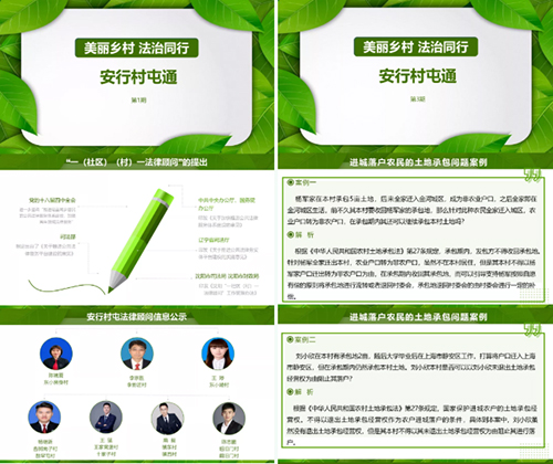 为进一步推进落实“一村一法律顾问”工作,农历新年后,辽宁安行律师事务所又推出了“安行村屯通”,计划每周二周四推送,内容主要围绕征地拆迁、土地权属、婚姻家庭、入学就医、社会保障、环境保护等方面涉及的法律知识和政策。